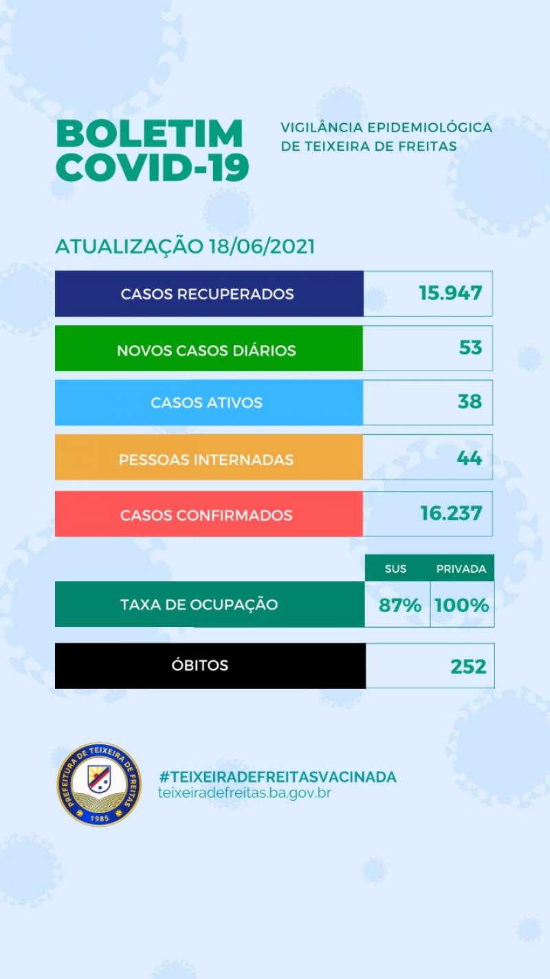 Nesta sexta-feira, 18 de junho, a Secretaria de Saúde de Teixeira de Freitas informou que houve registro de 53 novos casos positivados. Até o momento são 16.237 casos confirmados. Destes, 38 são considerados ativos, ou seja, as pessoas que ainda têm a possibilidade de transmitir o vírus. Até o momento são 252 mortes. A taxa de letalidade em Teixeira de Freitas é de 1,55% em relação aos casos confirmados. Nossa taxa de recuperação é de 98,21%, são 15.947 recuperados.