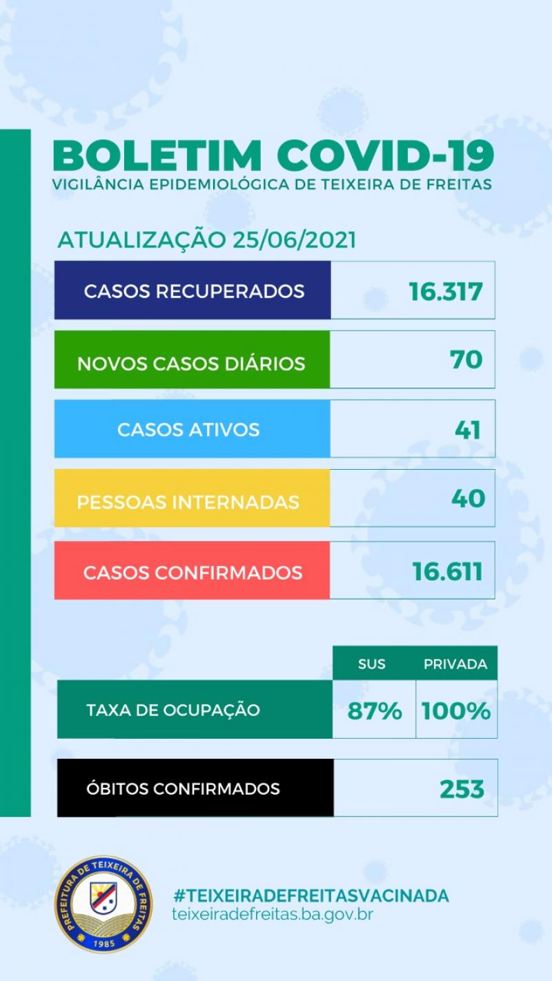 Nesta sexta-feira, 25 de junho, a Secretaria de Saúde de Teixeira de Freitas informou que houve registro de 70 novos casos positivados. Até o momento são 16.611 casos confirmados. Destes, 41 são considerados ativos, ou seja, as pessoas que ainda têm a possibilidade de transmitir o vírus. Até o momento são 253 mortes. A taxa de letalidade em Teixeira de Freitas é de 1,52% em relação aos casos confirmados. Nossa taxa de recuperação é de 98,23%, são 16.317 recuperados.