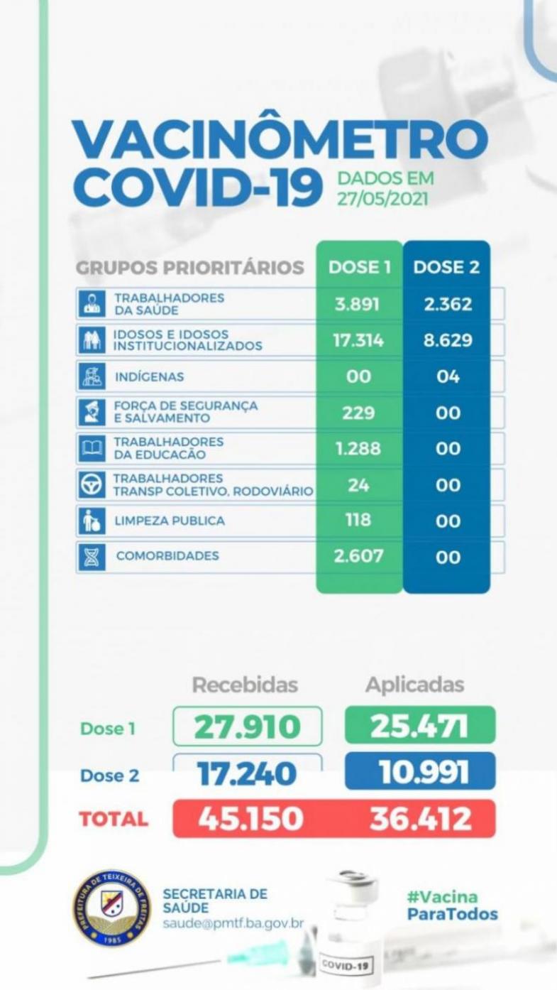 A Secretaria de Saúde de Teixeira de Freitas divulgou o índice de vacinômetro covid-19 do município. O registro mostra a quantidade de doses recebidas e aplicadas em munícipes. Confira: