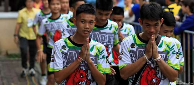 Vestindo camisas de futebol, os garotos sorriam e brincavam com uma bola de futebol ao chegarem ao local da entrevista, em Chiang Rai, no norte do país. Com aparência saudável, os garotos sorriam e faziam saudações tradicionais tailandesas.