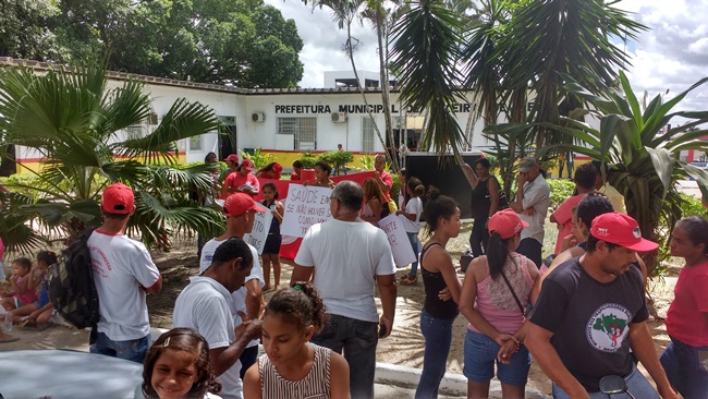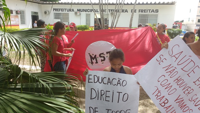 Integrantes do Movimento sem Terra (MST) , realizaram na manhã de quarta-feira (30), um protesto na sede da Prefeitura de Teixeira de Freitas, cobrando do prefeito João Bosco “João do PT”, o cumprimento da pauta onde reivindicam melhorias na educação.