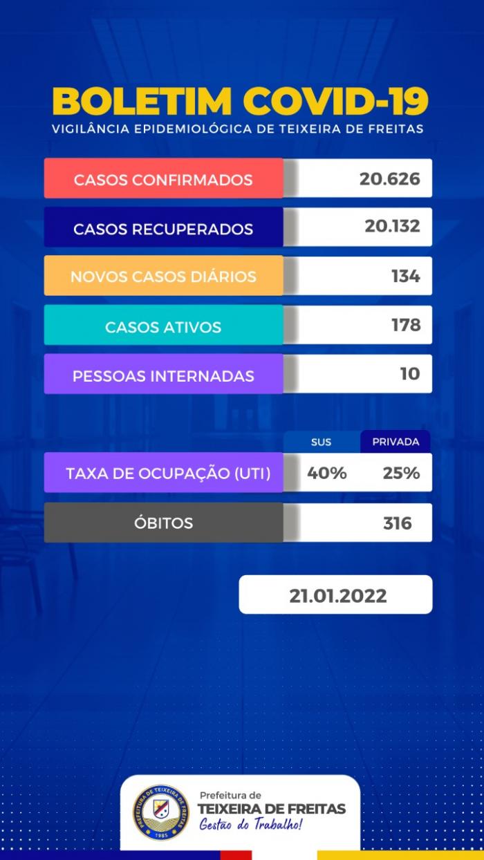 Nesta sexta-feira, 21 de janeiro, a Secretaria de Saúde de Teixeira de Freitas informou que há 134 novos casos positivados. Até o momento são 20.626 casos confirmados. Destes, 178 são considerados ativos, ou seja, as pessoas que ainda têm a possibilidade de transmitir o vírus. Já foram contabilizadas 316 mortes. A taxa de letalidade em Teixeira de Freitas é de 1,53% em relação aos casos confirmados. Nossa taxa de recuperação é de 97.91% são 20.132 recuperados.