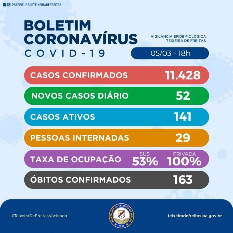 Na sexta-feira, 05 de março, a Secretaria de Saúde de Teixeira de Freitas informou o registro de 52 novos casos positivados. Até o momento são 11.428 casos confirmados. Destes, 141 são considerados ativos. Até o momento são 163 mortes. A taxa de letalidade em Teixeira de Freitas é de 1,44%, em relação aos casos confirmados.