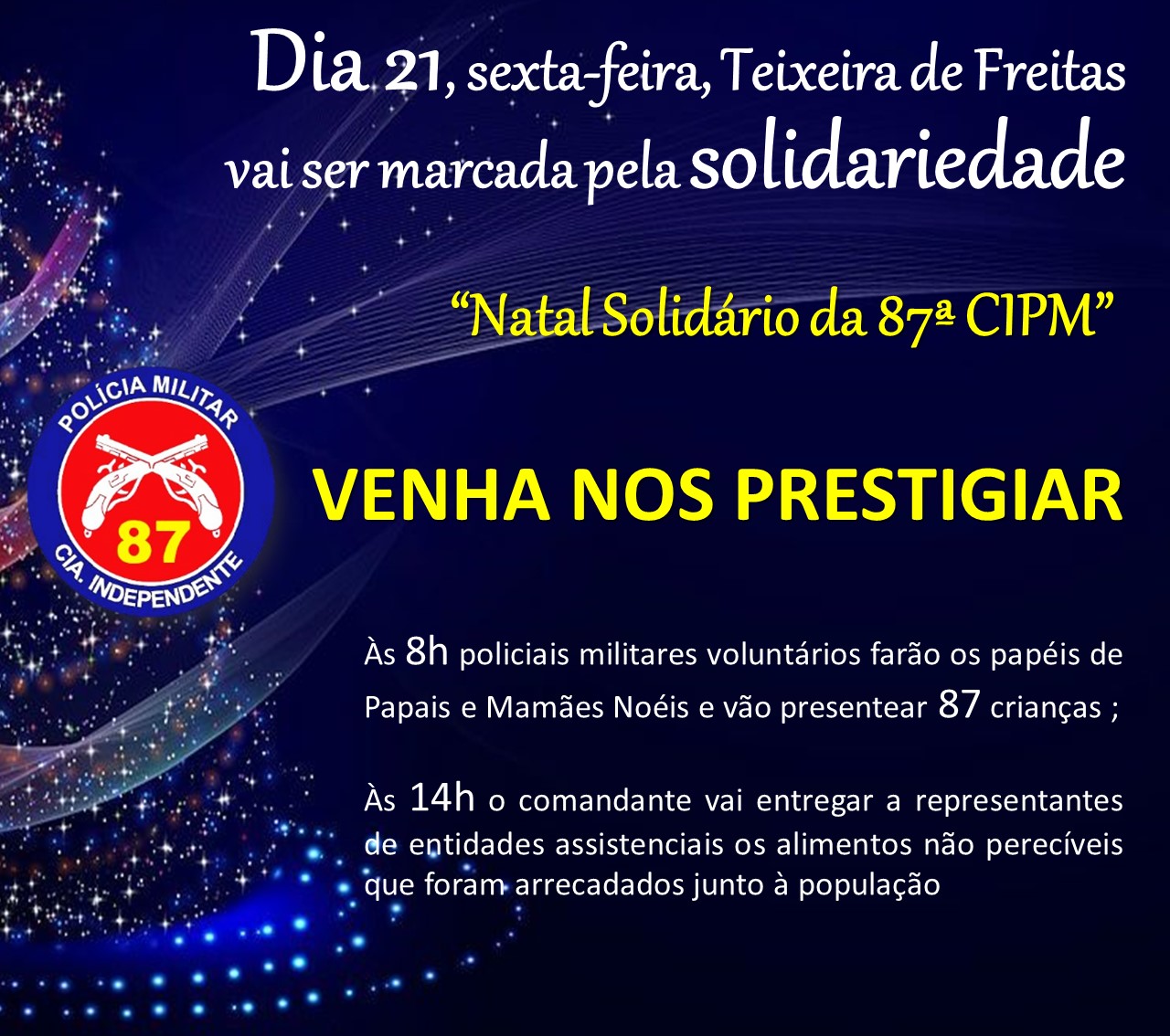 A cidade de Teixeira de Freitas nesta sexta-feira (21) vai ser marcada pela solidariedade. O comandante da 87ª Companhia Independente de Polícia Militar (CIPM), major Silvio Nunes vai entregar a representantes de entidades assistenciais de Teixeira de Freitas alimentos não perecíveis que foram arrecadados junto à população. A solenidade será às 14h, na sede da unidade, na Avenida das Nações, no Bairro Monte Castelo.