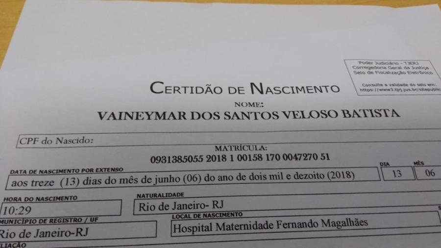 Quando Fernanda se ajeitou para conferir o papel, tomou um susto ao ver as letras garrafais que formavam o nome completo de seu rebento: “Vaineymar dos Santos Veloso Batista”, nascido “aos treze (13) dias do mês de junho (06) do ano de dois mil e dezoito (18)”.