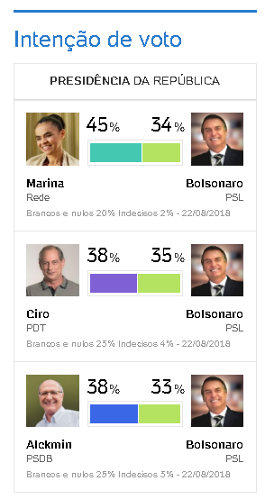 Na projeção de segundo turno entre Marina Silva e Bolsonaro, a candidata da Rede tem 45% das intenções de voto, contra 34% do candidato do PSL. Já o tucano Geraldo Alckmin aparece com 38%, contra 33% de Bolsonaro.