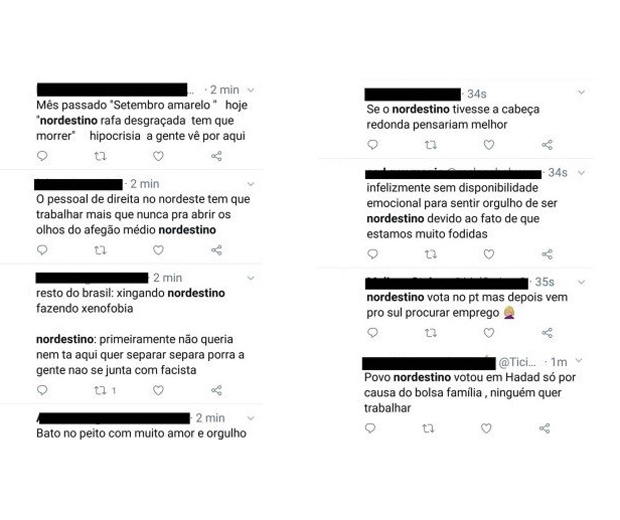 “Povo nordestino votou em Haddad só por causa do Bolsa Família. Ninguém quer trabalhar”, disse outra pessoa. “Nordestino vota no PT, mas depois vem pro Sul procurar emprego”, escreveu outra pessoa.