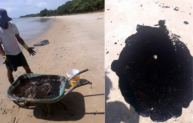 O óleo que vem contaminando praias do Nordeste nas últimas semanas atingiu na manhã de quinta-feira (14) a praia do Rio do Peixe, em Cumuruxatiba, distrito de Prado.