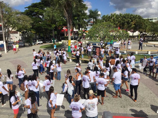Parentes e amigos do jovem Gabriel Vieira Aguiar, 20 anos, morto a tiros na porta da casa onde morava em Teixeira de Freitas, no sul da Bahia, foram às ruas do centro da cidade, neste sábado (7), para pedir justiça.