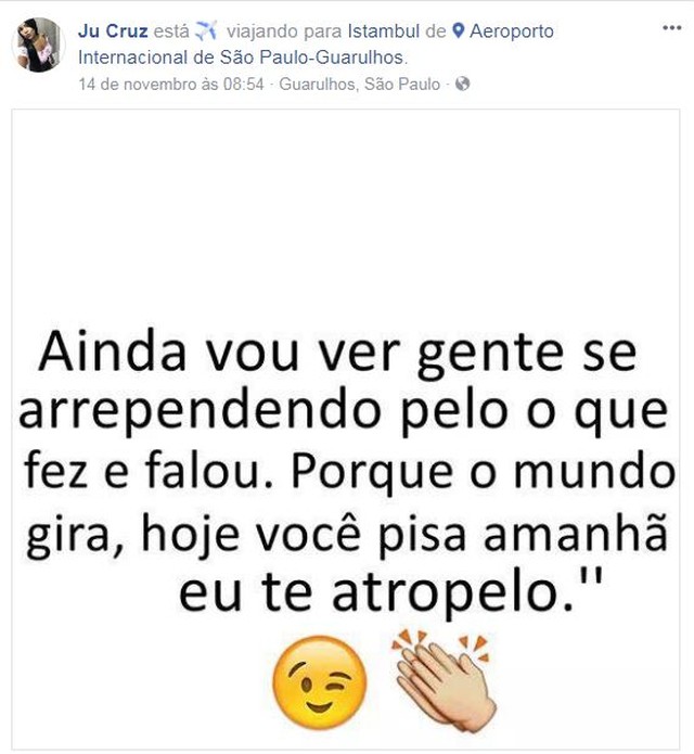 No dia 14 de novembro, Juliana publicou no Facebook uma postagem dizendo que estava no Aeroporto de Guarulhos, a caminho de Istambul.