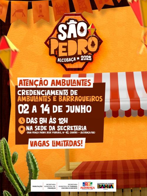 A Prefeitura Municipal de Alcobaça, por meio da Secretaria de Turismo, Cultura e Esporte, em parceria com o Departamento de Tributação, anunciou a abertura das inscrições para o cadastramento de vendedores ambulantes e comerciantes informais que desejam atuar durante o tradicional Arraiá de São Pedro 2025.