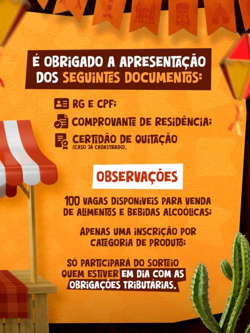 Somente ambulantes que estiverem em dia com suas obrigações tributárias poderão participar do sorteio das vagas, o que garante maior controle e organização dos espaços públicos durante a festa, assegurando também a segurança sanitária e o bom funcionamento do evento.