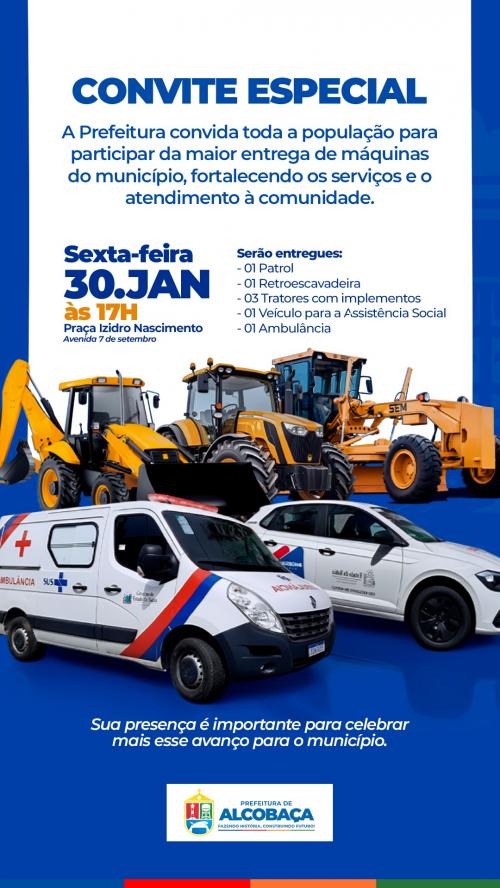A Prefeitura de Alcobaça realiza, nesta sexta-feira (30), às 17h, na Praça Izidro Nascimento, localizada na Avenida 7 de Setembro, a maior entrega de máquinas e veículos já registrada na história do município. O evento, promovido pelo prefeito Zico de Baiato, é aberto ao público e marca mais um avanço significativo no fortalecimento dos serviços públicos municipais.