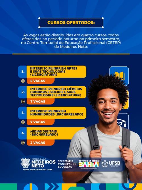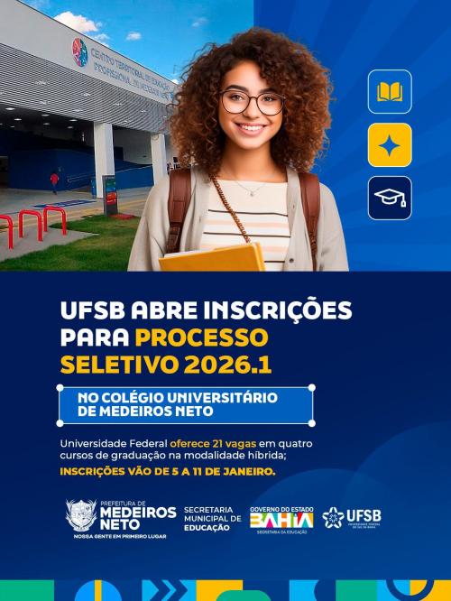 A Universidade Federal do Sul da Bahia (UFSB), em parceria com a Prefeitura de Medeiros Neto e o Governo do Estado da Bahia, abriu inscrições para o processo seletivo de ingresso em cursos de graduação no período letivo 2026.1. Ao todo, estão sendo ofertadas 21 vagas distribuídas em quatro cursos, por meio da Rede CUNI (Colégio Universitário), no polo de Medeiros Neto.