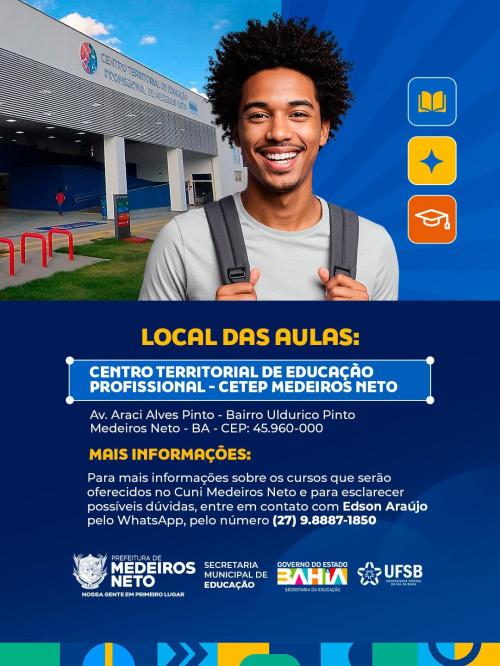 Dúvidas sobre os cursos ofertados no CUNI Medeiros Neto podem ser esclarecidas com Edson Araújo, pelo WhatsApp: (27) 9 8887-1850.