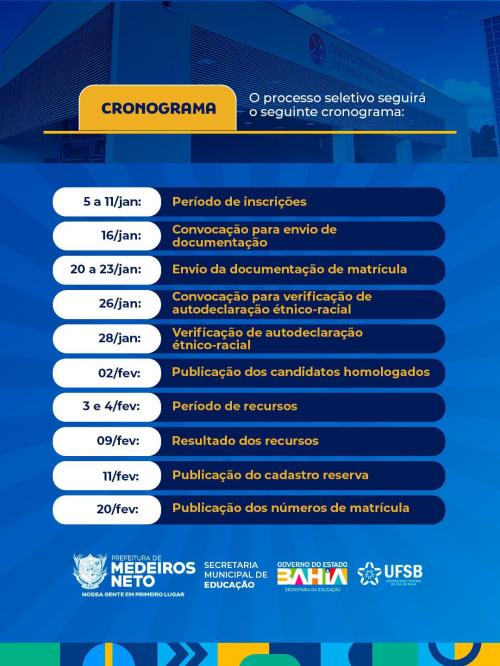 Prefeitura divulga vagas para o processo seletivo 2026.1 do Colégio Universitário da UFSB em Medeiros Neto
