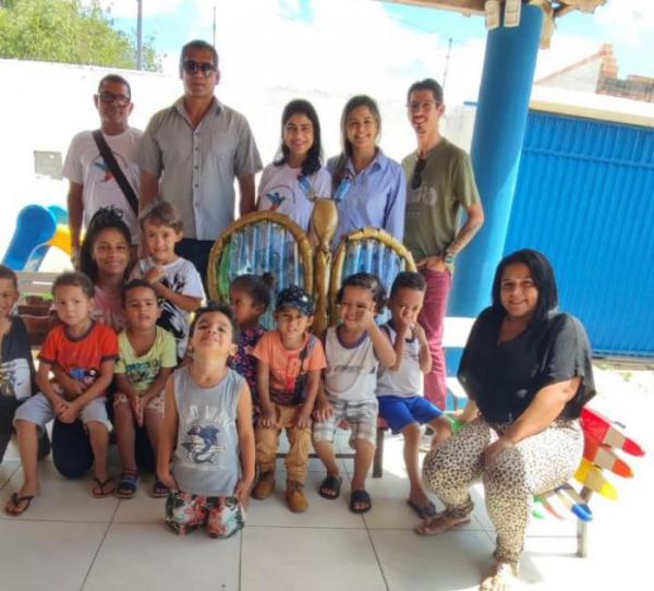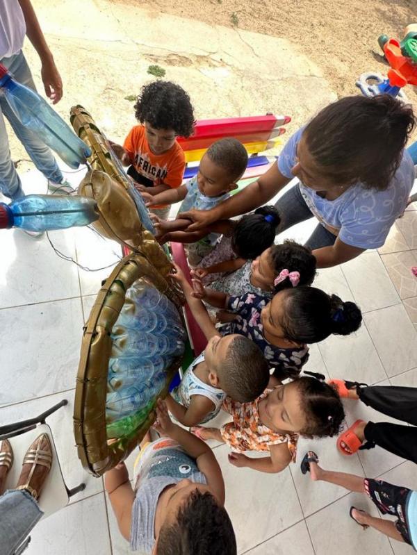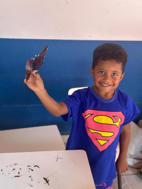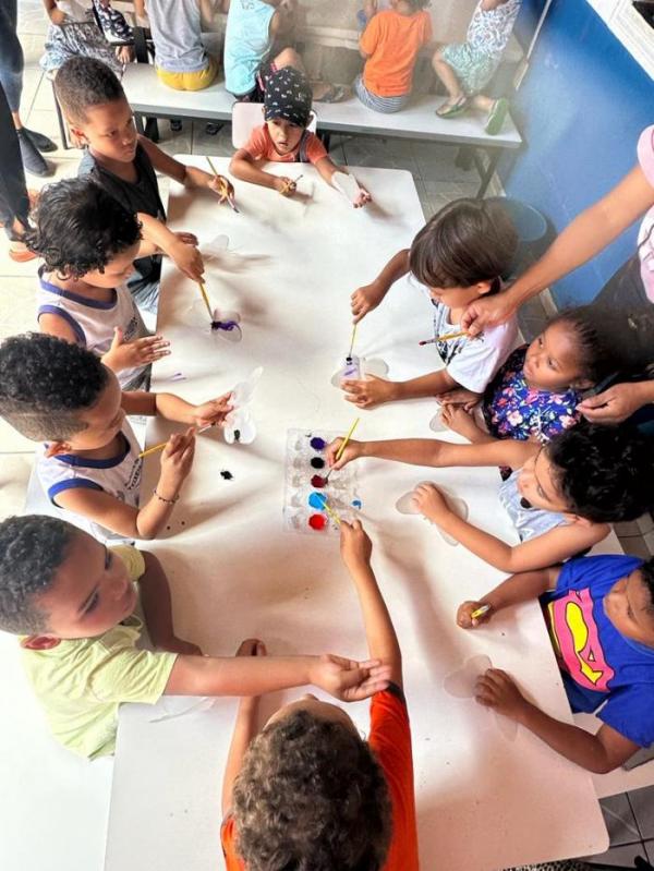 As crianças interagiram com a Equipe de Educação Ambiental de forma lúdica sobre a borboleta feita de material reciclado, com resíduos de garrafa pet, compartilhando informações sobre sua construção e sobre a importância de retirar resíduos plásticos do meio ambiente. A atividade faz parte da Campanha Combata a Poluição Plástica, trabalhada com as crianças esse ano.