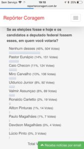 O site do Repórter Coragem realizou uma enquete que durou 20 dias e terminou na última segunda (23). Nossa equipe de redação decidiu perguntar aos eleitores em qual deputado eles pretendiam votar.