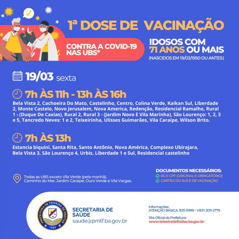 Na sexta-feira (19), a vacinação contra Covid-19 para Idosos com 71 anos ou mais será realizada nas Unidades Básicas de Saúde do município. Será ofertada a Dose 1 da vacina.