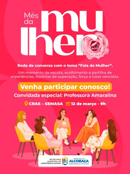 A roda de conversa será realizada no CRAS – SEMASA, no dia 12 de março, a partir das 9h. A Secretaria de Assistência Social convida todas as mulheres da comunidade a participarem do encontro, que promete ser um momento de troca, reflexão e fortalecimento coletivo.