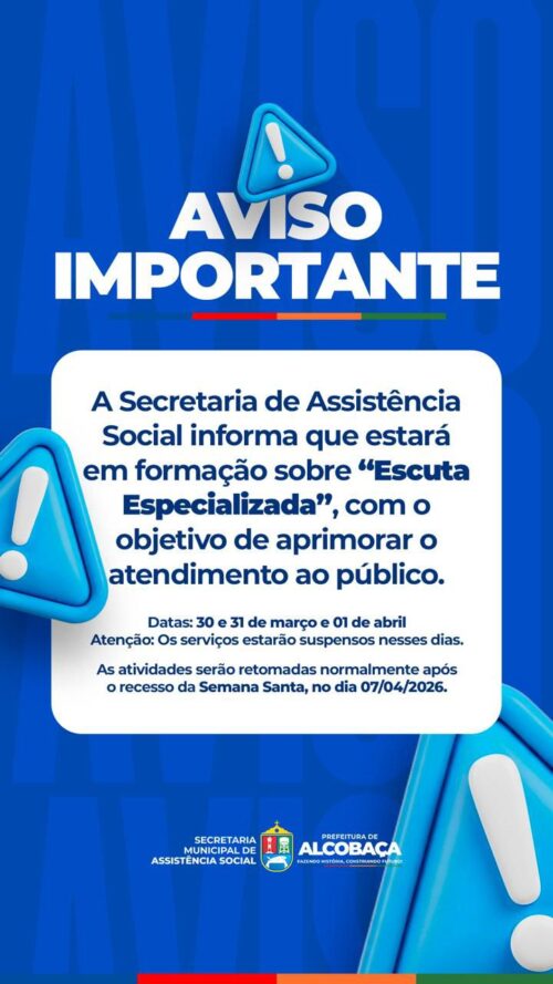 A Secretaria Municipal de Assistência Social de Alcobaça informou que os atendimentos ao público estarão temporariamente suspensos entre os dias 30 e 31 de março e 1º de abril. A interrupção ocorre devido à participação da equipe em uma formação voltada à “Escuta Especializada”.