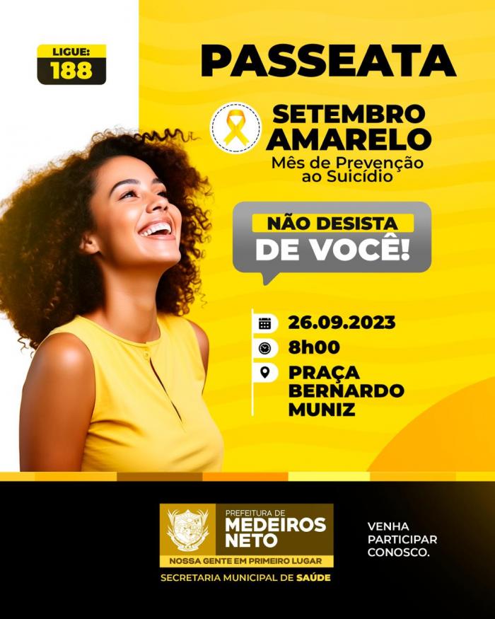 A Prefeitura de Medeiros Neto, através da Secretaria Municipal de Saúde, convida toda a população para participar de uma passeata no dia 26 de setembro, próxima terça-feira. A ação integra a campanha Setembro Amarelo.