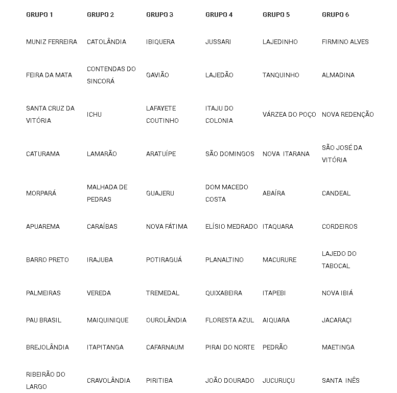 No sorteio desta quinta-feira (06/12) ficou definido que os municípios que fazem parte do grupo 1 estarão sob a responsabilidade do conselheiro Paolo Marconi; os do grupo 2 do conselheiro Fernando Vita; os do grupo 3 do conselheiro Plínio Carneiro Filho; os relacionados no grupo 4, do conselheiro Raimundo Moreira; os do grupo 5 do conselheiro José Alfredo Rocha Dias; e os grupo 6 do conselheiro Mário Negromonte.