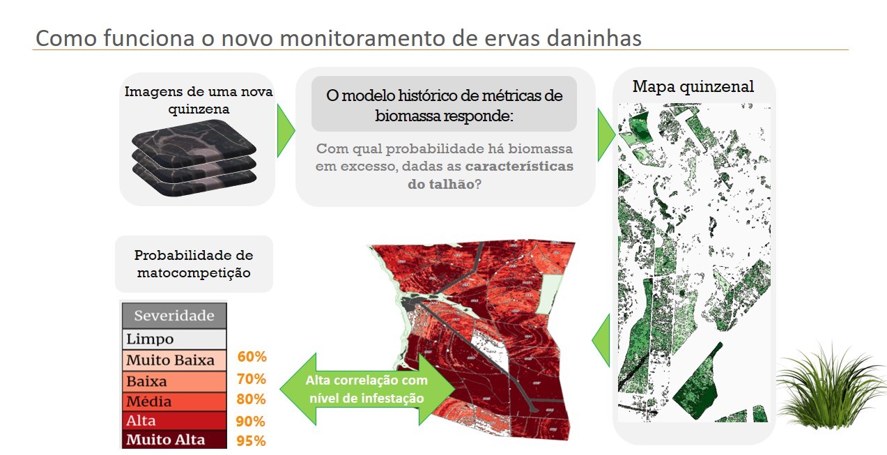 Com a implementação do novo sistema, o monitoramento em toda a área florestal da Fibria com plantios novos é feito via satélite. Por meio deste novo modelo, são emitidos quinzenalmente mapas de alerta, com recomendações de pontos de maior risco e necessidade controle de plantas daninhas. Quanto mais escuras forem as imagens no talhão, resultante do processamento, maior é a probabilidade de haver matocompetição e, assim, são priorizadas as ações de monitoramento e direcionadas as áreas para aplicação de herbicida.