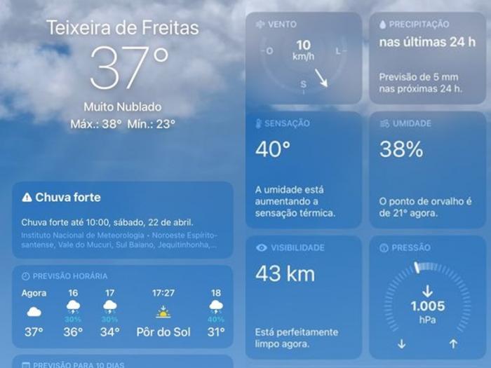 Os termômetros de Teixeira de Freitas registraram 37 graus na quarta-feira, 19 de abril. O dia quente e abafado, teve uma sensação térmica muito superior, chegando a 40 graus.