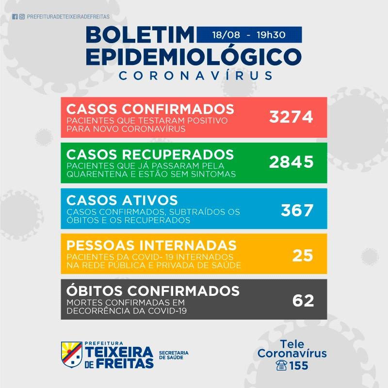 Na terça-feira, 18 de agosto, a Secretaria de Saúde de Teixeira de Freitas comunicou 81 novos casos positivados. Ao todo, são 3193. Destes, 367 são considerados ativos.