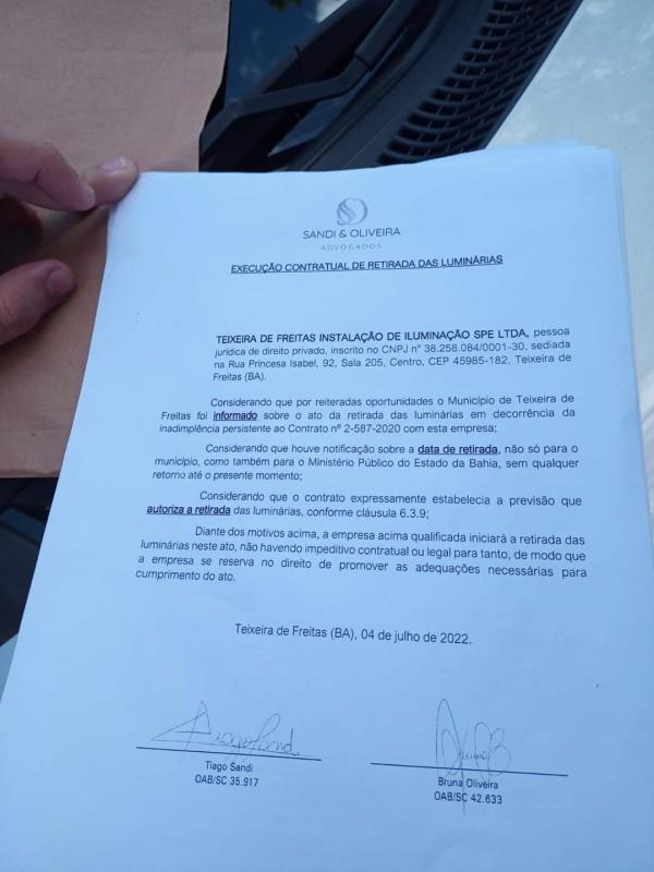 A empresa destacou que informou a prefeitura reiteradas vezes sobre o ato de retirada das luminárias em decorrência da inadimplência, além de notificar também o Ministério Público do Estado da Bahia, mas não obteve respostas.