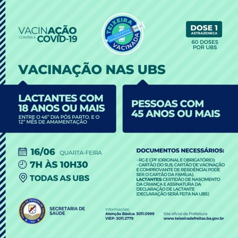 Mais ações de vacinação em nosso município. Nesta quarta-feira, 16 de junho, acontece a aplicação de Dose 1 para lactantes com 18 anos ou mais em todas as Unidades Básicas de Saúde (UBS) das 7h às 10h30. São consideradas lactantes mulheres entre o 46.º dia pós parto, e o 12º mês de amamentação