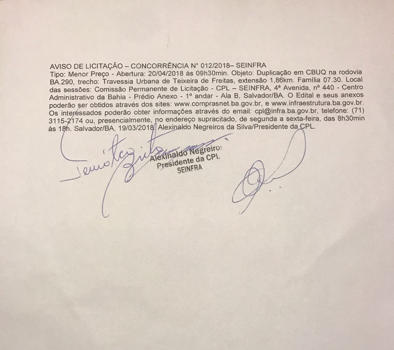 Témóteo Brito recebeu o Aviso de Licitação da Duplicação do trecho urbano da BA 290, que acontecerá em 20 de abril de 2018, às 9h30 na Secretaria de Infraestrutura do Estado da Bahia (SEINFRA).