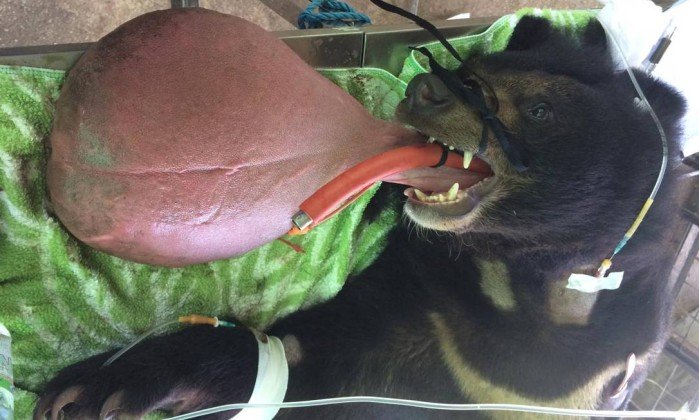 Um urso foi submetido a uma cirurgia de emergência, em Mianmar, para remover sua língua após ela se tornar tão pesada que saiu de sua boca e caiu no chão. O órgão estava pesando 3kg.