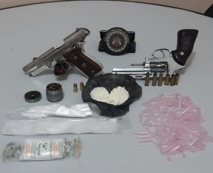 Um revólver, uma pistola, 50 gramas de cocaína e 70 pinos de drogas, que foram encontrados com os homens, foram apreendidos e levados para a delegacia da cidade.