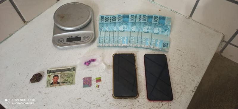 Por volta das 17 horas, uma guarnição da CIPE MATA ATLÂNTICA, em rondas no bairro liberdade 1 próximo ao posto de saúde, abordamos um veículo VW gol, cor prata, placa HEQ1034, e em busca pessoal nos dois suspeitos ocupantes do veículo, foi encontrado com o carona um pedaço de maconha, R$ 159,00 reais em dinheiro e um aparelho celular; com o condutor R$ 21,00 reais, 17 selos de LSD, (droga conhecida por quadrado) e um aparelho celular; dando sequência à diligência deslocamos a casa de um dos suspeitos situado na Av Getúlio Vargas N° 4772, Centro de Teixeira de Freitas, e encontramos 04 balas de metanfetamina ( droga conhecida por balinhas), R$ 1500,00 reais e uma balança de precisão.