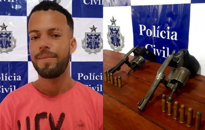 O seu pai autorizou a entrada dos policiais no recinto. Após autorização, foram realizadas buscas, sendo encontrado no quarto do acusado, 02 revolveres, sendo um de calibre 32 (contendo 05 munições intactas) e outro calibre 38 (contendo 06 munições intactas). O acusado foi conduzido para a delegacia, onde foi flagranteado pela prática do crime de Posse Ilegal de Arma de Fogo, bem como, foi dado cumprimento ao Mandado de Prisão Preventiva em seu desfavor, encontrando-se o mesmo na carceragem da Polícia Civil, à disposição da Justiça.