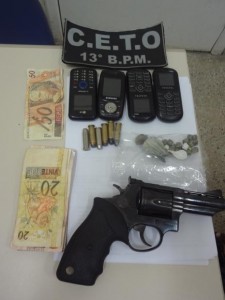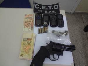 Ao ser abordado na noite de sexta-feira pelos homens do CETO, fato ocorrido na Rua Céu Azul, no Liberdade II, foi encontrado em seu poder R$ 146, sendo que deste dinheiro havia uma nota de R$ 50 com características de nota falsa, quatro aparelhos celulares, dois papelotes de cocaína, 23 pedras de crack e um revólver Taurus calibre 38, com seis cartuchos.