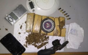 Matheus transportava uma mochila camuflada, contendo mais de meio quilo de maconha, duas balanças de precisão e duas cadernetas com o movimento financeiro do tráfico. Com ele também foi encontrado um revólver.