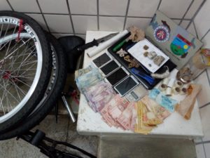 Foram apreendidos 4 embalagens de tamanhos diversos de maconha , totalizando 60g, embalagens para fracionar o entorpecente, uma bicicleta desmontada, 4 celulares, 1 Notebook, 1 balança de precisão e R$ 1.460,00 em espécie.