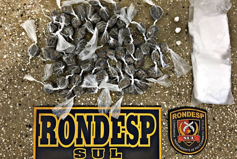 Na última quarta-feira (21), a RONDESP Sul, em combate ao tráfico de drogas, realizava patrulhamento tático pelo bairro Liberdade II, quando avistaram uma mulher em atitude suspeita, que começou a se afastar de um muro de uma construção abandonada. Os militares realizaram a aproximação e perceberam que ela havia arremessado algo.