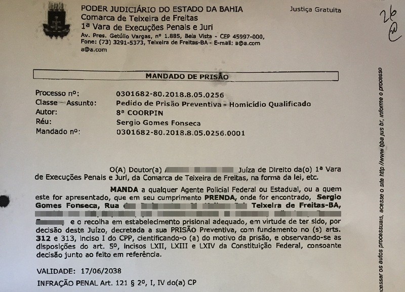 Como já havia um mandado de prisão decretado, o delegado titular, Ricardo Amaral, deu cumprimento ao mandado e o autor foi conduzido para o Conjunto Penal de Teixeira de Freitas, e ele será ouvido na próxima quinta-feira, 02 de agosto.
