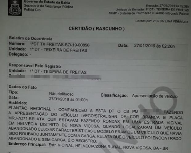 Segundo o caminhoneiro, após o veículo ser recuperado, o proprietário procurou a Delegacia de Teixeira de Freitas (sede da 8ª COORPIN) para retirar a carreta recuperada, mas, segundo informações, o veículo só poderá ser liberado após a perícia. O delegado emitiu uma guia para que o veículo fosse periciado, mas, segundo a denúncia do representante do sindicato, o perito está de férias e só poderá fazer a perícia depois do dia 21 de fevereiro. Segundo informações levantadas por nossa equipe, o perito Eduardo Portugal, lotado na CRPT de Teixeira de Freitas, teria saído de férias e levado as guias da perícia.