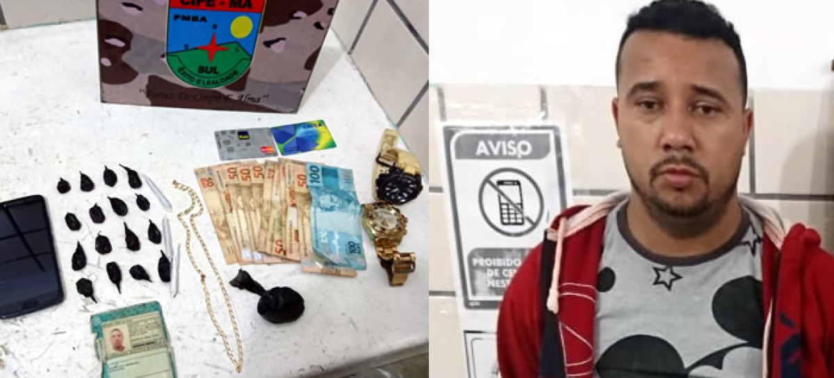 Os militares interceptaram o suspeito, que foi identificado como: Epitácio Rocha de Souza, de 27 anos de idade. Com ele foram encontrados dezesseis papelotes de cocaína, três cigarros e mais uma porção pesando 14 gramas de maconha, um relógio dourado com fundo falso, usado para transportar cocaína e o valor em R$ 650,00 em espécie.
