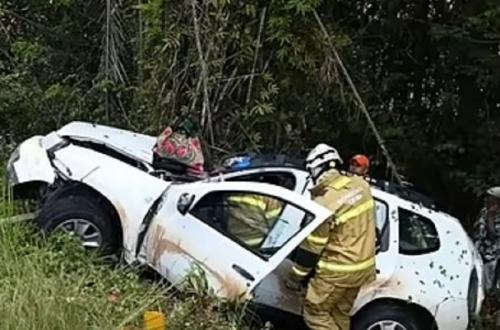 Porto Seguro: Um carro saiu da pista e bateu em uma árvore na BR-367, em Porto Seguro, no fim da manhã desta quarta-feira (21). O impacto deixou o lado do carona totalmente destruído.