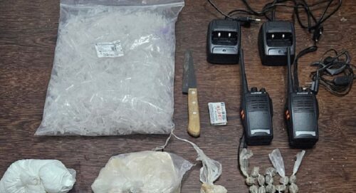 Em uma varredura no perímetro, os policiais encontraram, dentro de uma mochila preta, os seguintes materiais: uma porção de cocaína, 24 buchas de maconha, um tablete de crack, vários pinos endorff vazios e dois rádios Baofeng com bases carregadoras.