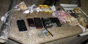 Durante a revista os militares encontram com Kelvin e Adalberto, 5 celulares, saquinhos para embalar drogas, 7 munições calibre 38, 1 máquina fotográfica, R$ 189 em espécie, dinheiro supostamente proveniente do tráfico de entorpecentes, 35 gramas de ckack, 30 gramas de cocaína, além de uma pequena quantidade de maconha.