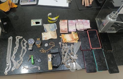 Durante a averiguação, os policiais localizaram 30 buchas de maconha, um aparelho celular LG vermelho, um Motorola azul, um Motorola branco, um Redmi salmão, um Samsung preto, um Redmi azul escuro e um Redmi azul claro. Além disso, foram encontradas quatro correntes de pescoço prateadas e a quantia de R$ 197,00 em espécie.