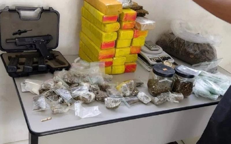 Com os envolvidos foram apreendidos 685 comprimidos de ecstasy, barras de maconha pesando 16,5 kg, porções de haxixe e cocaína, uma pistola e 46 munições calibres 380, além de R$ 5.126,00.