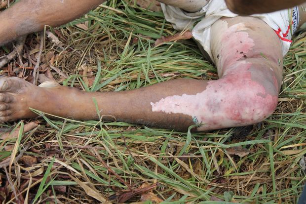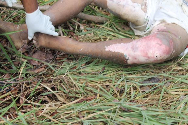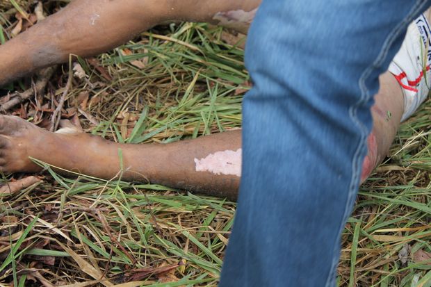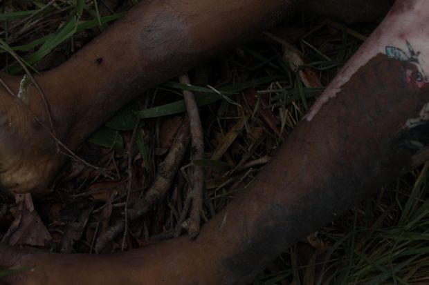 O homem trajava apenas cueca preta e short branco, e tinha uma tatuagem de serpente na perna esquerda, as roupas foram queimadas no local, uma garrafa plástica foi encontrada próxima onde as roupas da vítima foram queimadas, supostamente a garrafa foi usada para transportar gasolina.
